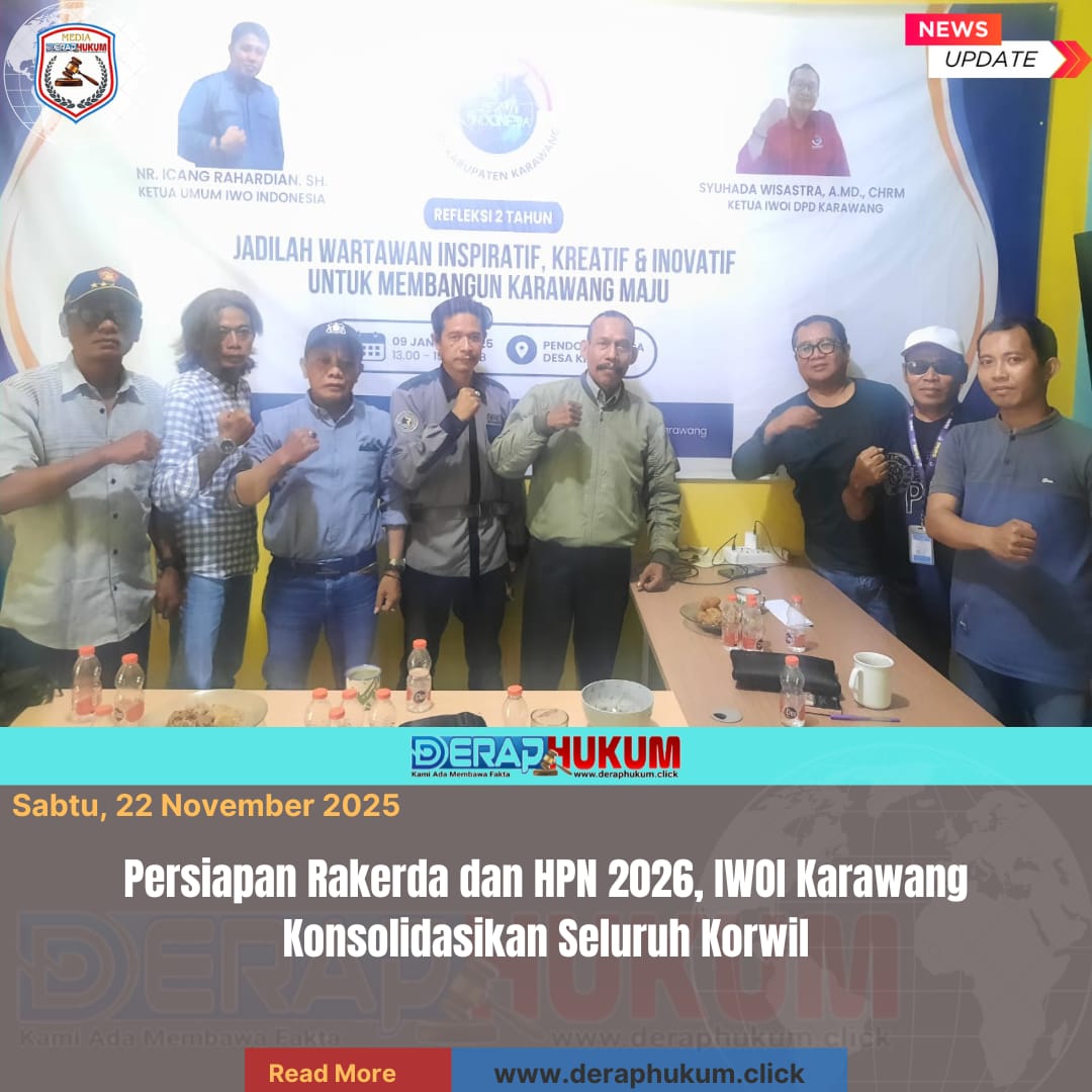 KARAWANG, Jawa Barat | DerapHukum.click | Ikatan Wartawan Online Indonesia (IWOI) DPD Karawang menggelar rapat koordinasi bersama seluruh ketua dan wakil ketua koordinator wilayah (korwil) dalam rangka persiapan Rapat Kerja Daerah (Rakerda) serta Hari Pers Nasional (HPN) 2026. Rapat berlangsung di Kantor Sekretariat IWOI Karawang, Perumahan Jasmine Village, Cluster Melbourne A11, Sabtu (22/11/2025) pukul 13.00–15.00 WIB.