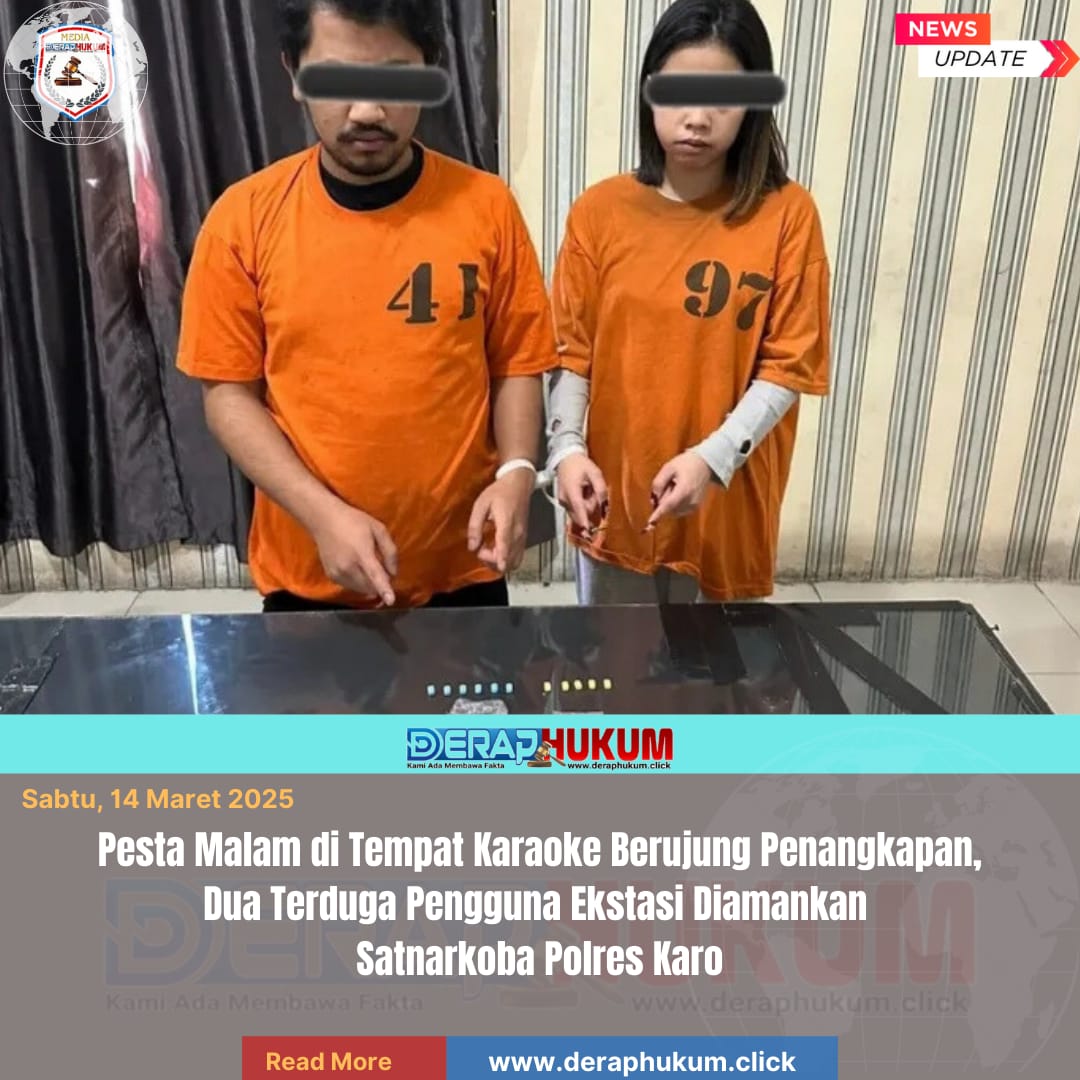 “Petugas melakukan penindakan terhadap dua orang yang diduga terlibat dalam penyalahgunaan narkotika jenis ekstasi di salah satu tempat karaoke di Berastagi. Keduanya langsung diamankan untuk dilakukan pemeriksaan lebih lanjut,” ujar JH. Pardede, Sabtu(14/3) pagi di Mapolres.