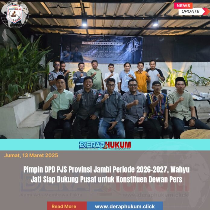Jambi, | Deraphukum.click | Wahyu Jati Syahwaludin kembali pimpinan DPD Pro Jurnalismedia Siber (PJS) Provinsi Jambi periode 2026-2027. Ia terpilih secara aklamasi pada Musyawarah Daerah (Musda) yang diselenggarakan di Bloom Coffee & Place, Telanaipura, Kota Jambi, Kamis (12/03/2026) malam.