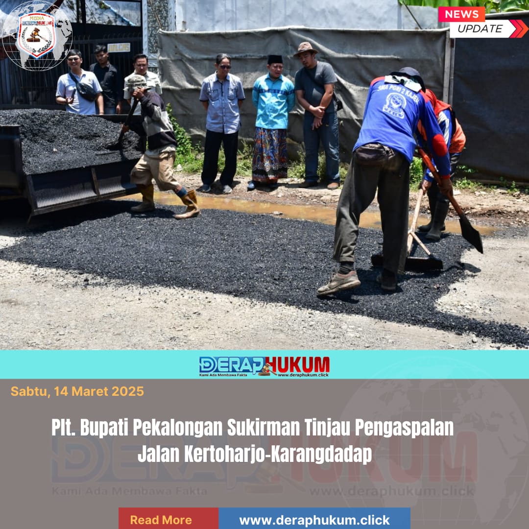 Pekalongan,Jawa Tengah | deraphukum.click | Pelaksana Tugas (Plt.) Bupati Pekalongan, Sukirman meninjau langsung proses pengaspalan jalan Kabupaten ruas Kertoharjo–Karangdadap yang berada di Desa Watusalam, Kecamatan Buaran, Sabtu (14/03/2026) siang.