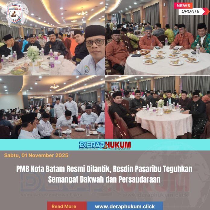 Batam, | Deraphukum.click | Acara Pelantikan dan Rapat Kerja Persatuan Muballigh Kota Batam (PMB) masa khidmat 2025–2030 berlangsung khidmat dan penuh kebersamaan pada Sabtu, 1 November 2025 / 10 Jumadil Awal 1447 H. Kegiatan yang mengusung tema “Meneguhkan Ukhuwah, Menebar Dakwah” ini menjadi momen penting dalam memperkuat peran muballigh sebagai penggerak dakwah dan penjaga moral masyarakat di Kota Batam.