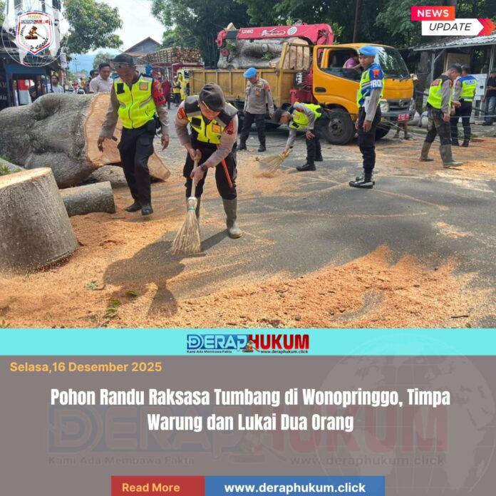 Pekalongan,Jawa Tengah | Deraphukum.click | Polres Pekalongan – Polda Jateng – Insiden pohon tumbang mengejutkan warga di Jalan Raya Wonopringgo, Desa Rowokembu, Kecamatan Wonopringgo, Kabupaten Pekalongan, Selasa (16/12/2025) siang. Sebuah pohon randu raksasa setinggi 23 meter tiba-tiba ambruk melintang di tengah jalan raya, tepat di depan Asrama Kipan C Yonif 407/Padmakusuma.