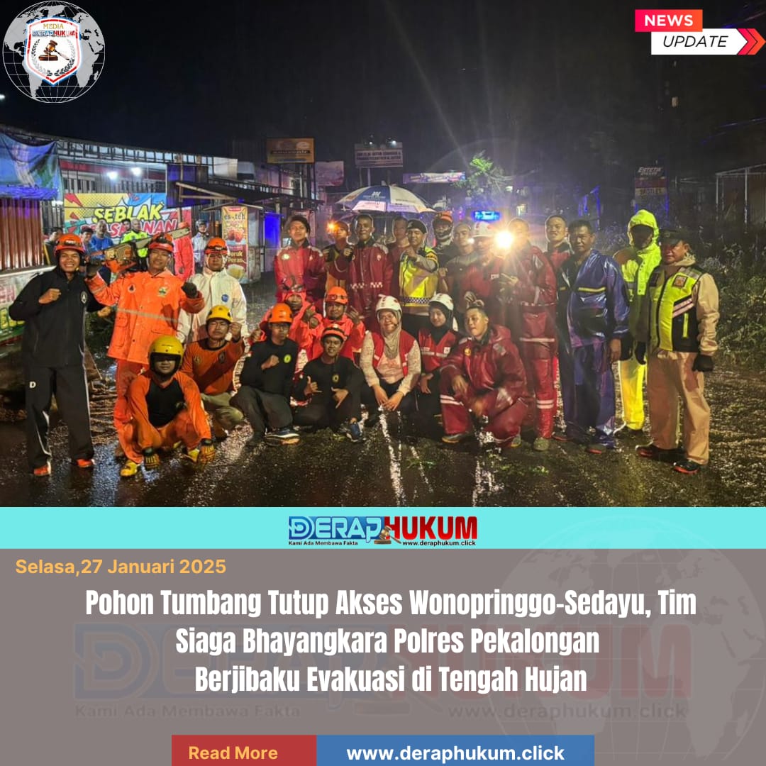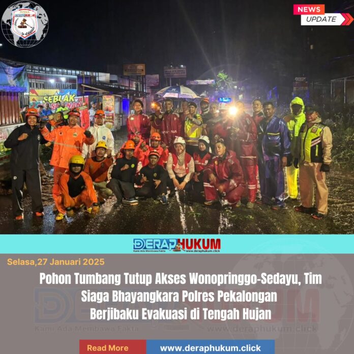 Pekalongan,Jawa Tengah | Deraphukum.click | Polres Pekalongan – Polda Jateng – Akses jalan raya yang menghubungkan Wonopringgo dan Sedayu sempat lumpuh total setelah sebuah pohon besar tumbang akibat diterjang angin kencang dan hujan deras, Senin (26/01/2026) malam. Beruntung, kesigapan personel kepolisian yang langsung turun ke lokasi membuat jalur utama tersebut kembali normal dalam waktu singkat.