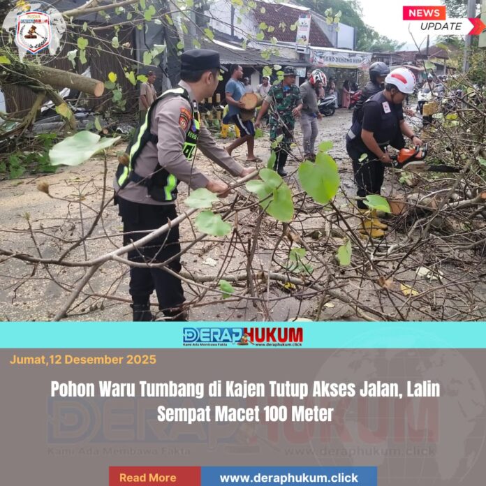 Pekalongan,Jawa Tengah | Deraphukum.click | Polres Pekalongan – Polda Jateng – Pohon jenis Waru dilaporkan tumbang dan melintang di jalan raya menuju Desa Sinangohprendeng, tepatnya di perempatan lampu merah Terminal Bus Kajen, Kabupaten Pekalongan. Insiden ini terjadi pada Jumat (12/12/2025) sekitar pukul 07.00 wib, menyebabkan kemacetan arus lalu lintas sepanjang sekitar 100 meter.