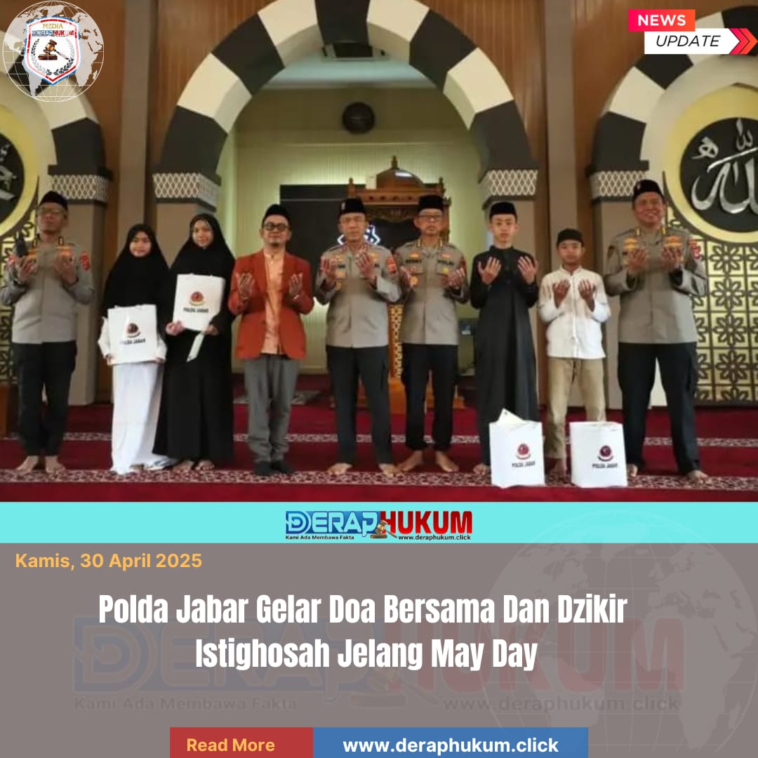 Bandung,Jawa Barat | Deraphukum.click | Dalam rangka menyambut peringatan Hari Buruh Internasional (May Day), Polda Jawa Barat menggelar kegiatan doa bersama dan dzikir istighosah sebagai bentuk ikhtiar spiritual guna menjaga situasi kamtibmas yang aman dan kondusif di wilayah Jawa Barat.