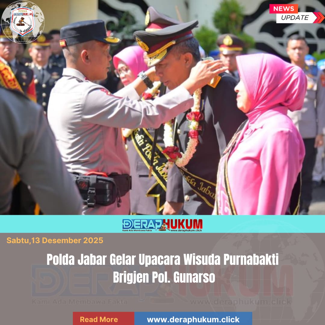 Polda Jawa Barat melaksanakan Upacara Wisuda Purnabakti sebagai bentuk penghargaan atas dedikasi dan pengabdian para personel yang memasuki masa purnatugas. Kegiatan berlangsung di Lapangan Upacara Polda Jabar dan dihadiri oleh pejabat utama Polda Jabar, para sesepuh PP Polri, Bhayangkari, keluarga wisudawan serta para personel yang hadir mendampingi. Jumat (12/12/2025).