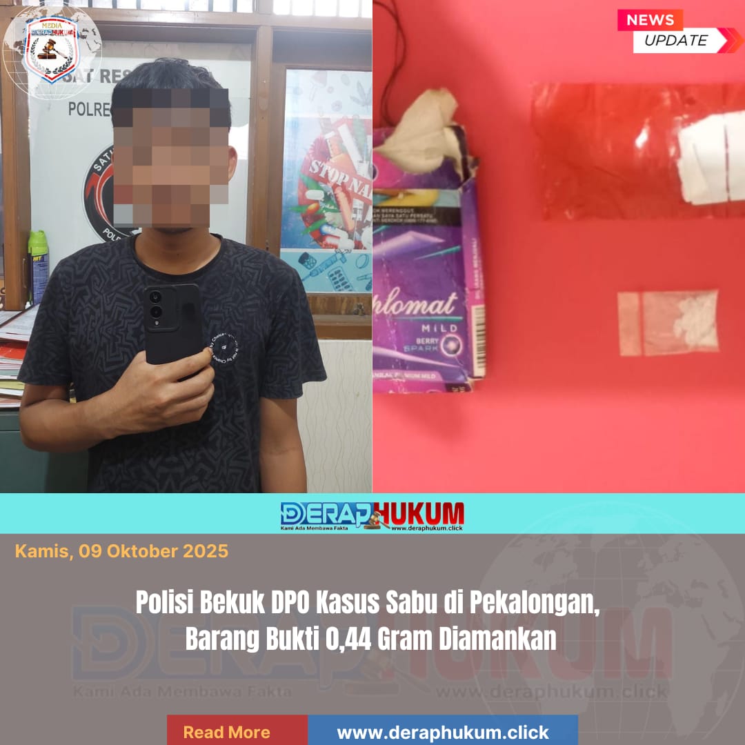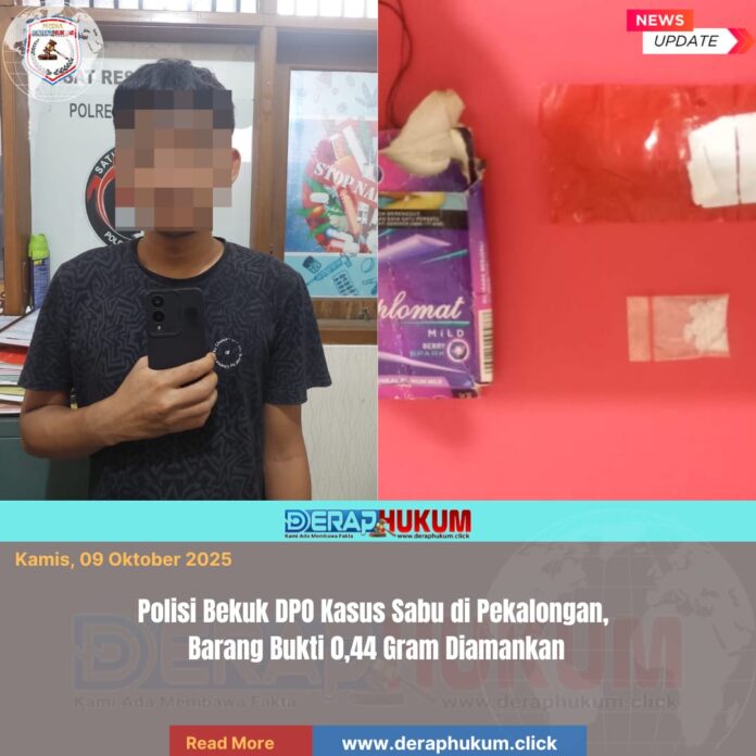 Pekalongan,Jawa Tengah | Deraphukum.click | Polres Pekalongan – Polda Jateng – Jajaran Satres Narkoba Polres Pekalongan berhasil meringkus seorang pria berstatus DPO dalam kasus peredaran narkotika jenis sabu. Pelaku berinisial BDW alias Doni (27), warga Desa Sawangan, Kecamatan Doro, Kabupaten Pekalongan, ditangkap di rumah istrinya pada Rabu (08/10/2025) pagi.