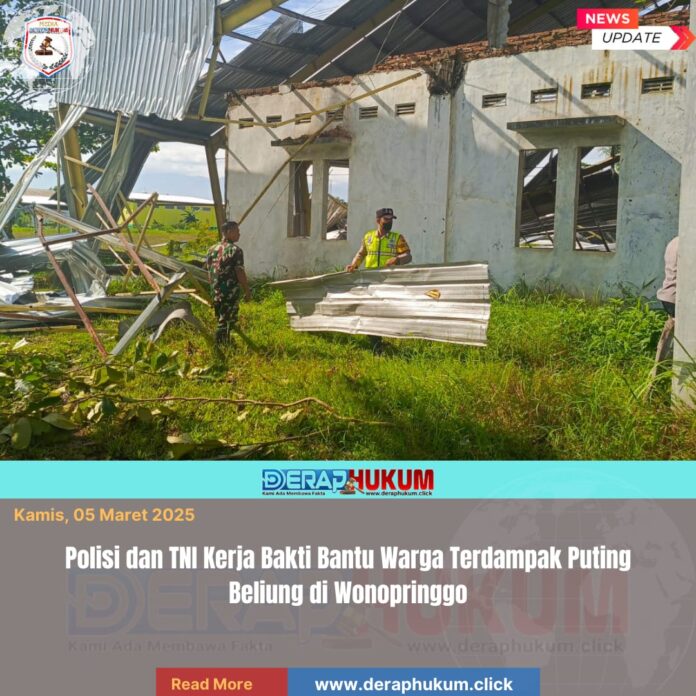Pekalongan,Jawa Tengah | Deraphukum.click | Polres Pekalongan – Polda Jateng – Polsek Wonopringgo bersama anggota Koramil melaksanakan pengecekan sekaligus kerja bakti di sejumlah lokasi yang terdampak bencana angin puting beliung pada Kamis (5/3/2026) pagi. Kegiatan tersebut dipimpin langsung oleh Kapolsek Wonopringgo AKP Adhi Agung P., A.Md., bersama anggota.
