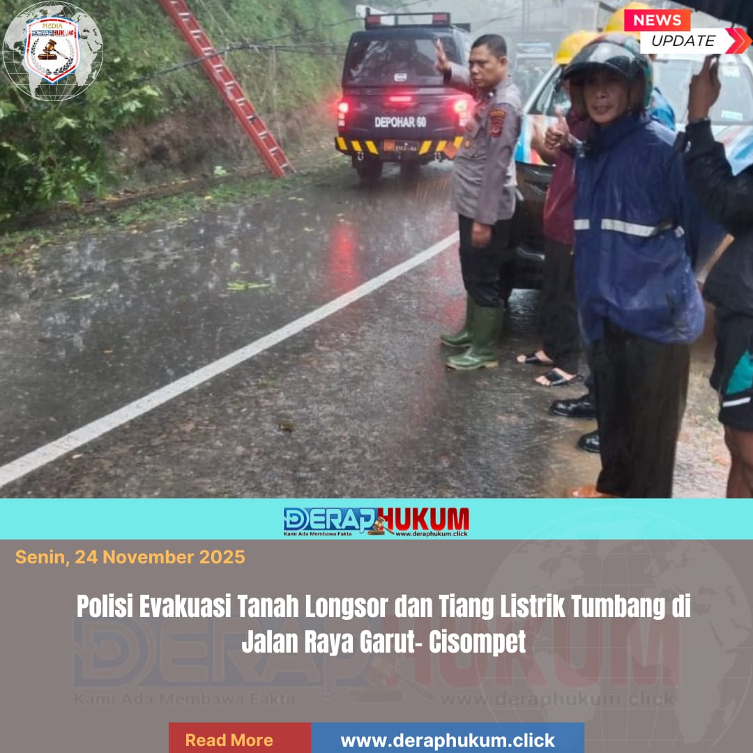 Garut,Jawa Barat | Deraphukum.click | Polsek Cisompet Polres Garut bersama unsur TNI, petugas PLN, serta warga setempat melakukan evakuasi material tanah longsor yang menutup badan jalan di ruas Jalan Raya Garut–Cisompet, tepatnya di Kampung Nyalindung, Desa Sindangsari, Kecamatan Cisompet, Kabupaten Garut.