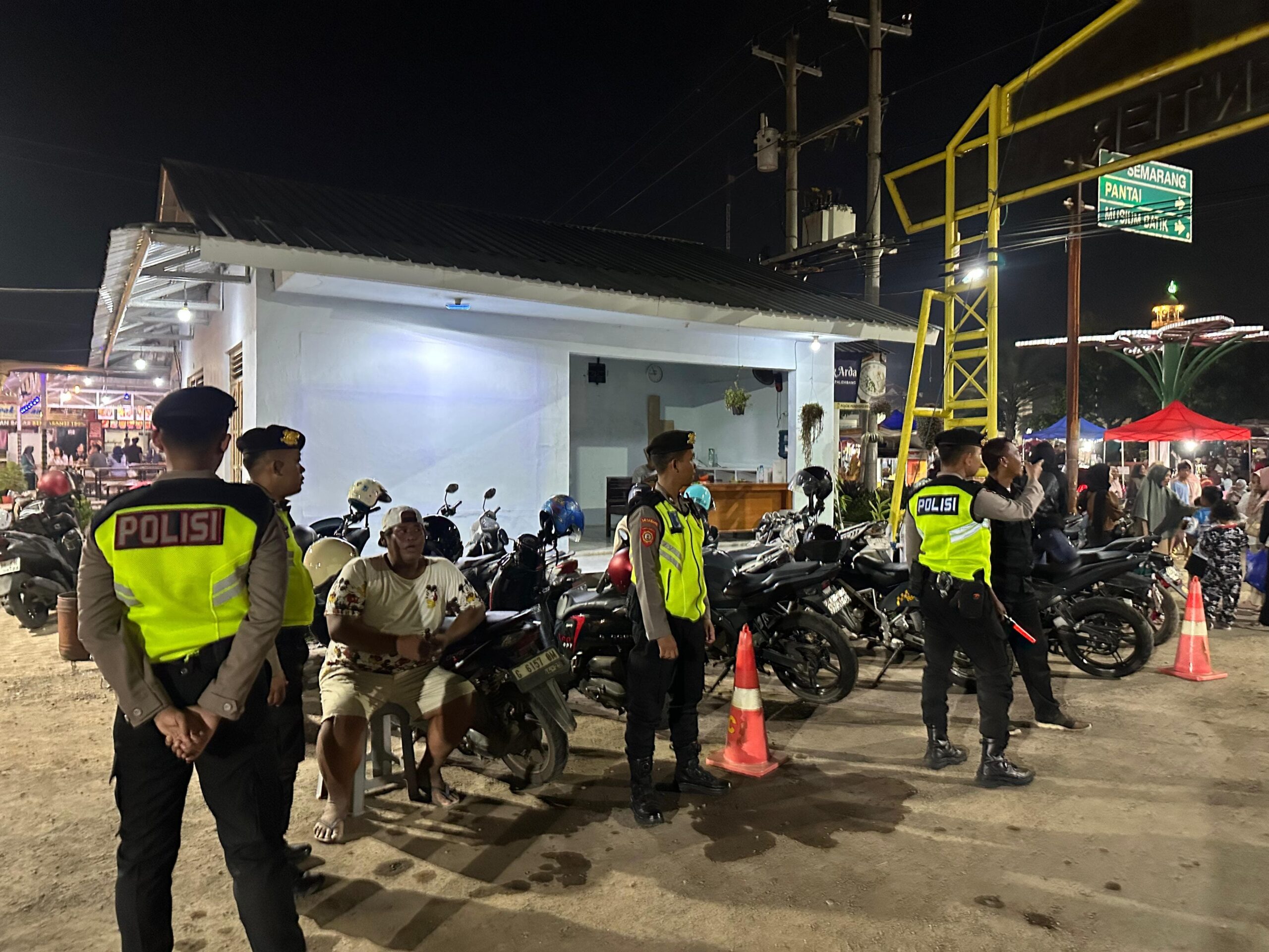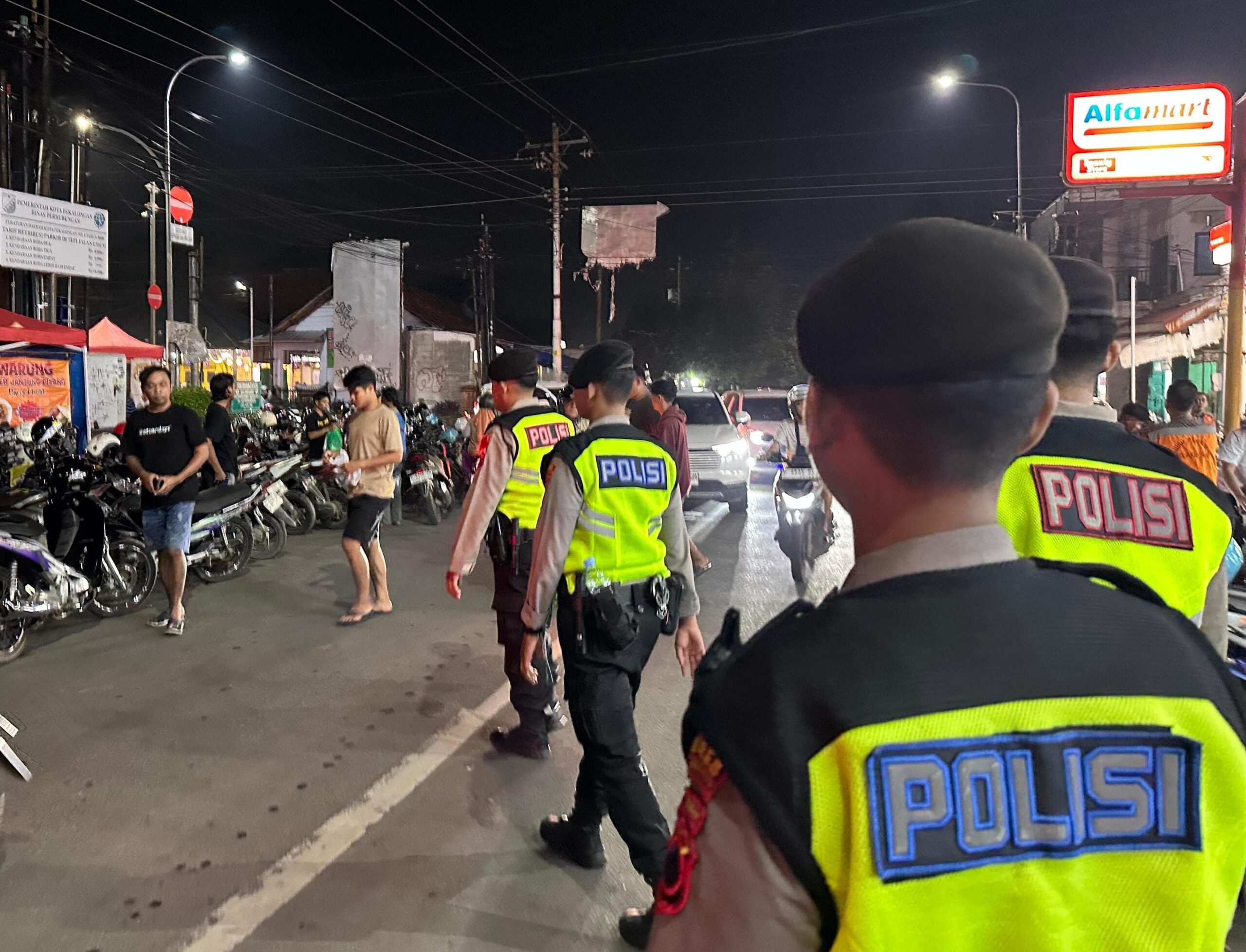 Sejumlah personel Sat Samapta yang tergabung dalam Subsatgas Pam tempat keramaian dan giat ibadah Operasi Ketupat Candi 2026 diterjunkan untuk melakukan pemantauan situasi di lokasi yang ramai aktivitas masyarakat pada malam hari.