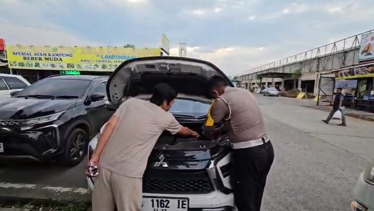 Menindaklanjuti laporan tersebut, Kapospam Rest Area 338A, Ipda Deny Saputra, S.H., bersama sejumlah personel langsung menuju lokasi parkir kendaraan dengan membawa peralatan perbengkelan darurat.