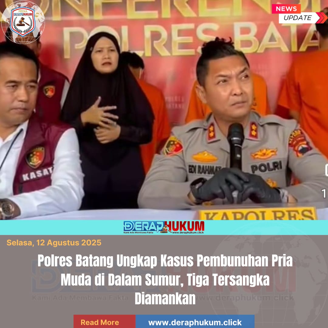 Batang, | Deraphukum.click |12 Agustus 2025 Polres Batang menggelar press release di lobi Polres Batang mengenai kasus pembunuhan seorang pria bernama Ahmad Mughni Sodiq, berusia 25 tahun, yang ditemukan meninggal dunia di dalam sumur belakang kompleks ruko pasar, tepatnya di samping SLTP N 01 Wonotunggal, Dukuh Tegalsari, Desa Wonotunggal, Kecamatan Wonotunggal, Kabupaten Batang, pada Minggu, 9 Agustus 2025, pukul 08.30 WIB.