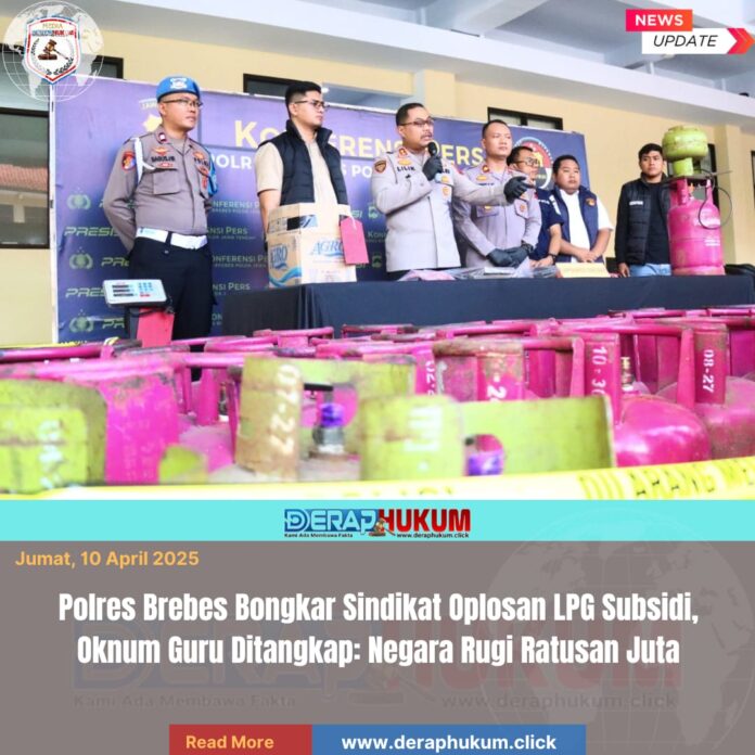 Brebes,Jawa Tengah | Deraphukum.click | Kepolisian Resor Brebes berhasil mengungkap praktik penyalahgunaan Liquefied Petroleum Gas (LPG) bersubsidi ukuran 3 kilogram yang dipindahkan ke tabung nonsubsidi ukuran 12 kilogram. Dalam kasus ini, dua orang pelaku berhasil diamankan.