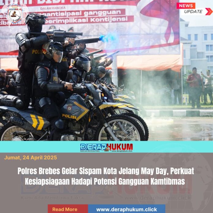 Brebes,Jawa Tengah | Deraphukum.click | Kepolisian Resor (Polres) Brebes menggelar Latihan Terpadu Sistem Pengamanan Kota (Sispam Kota) sebagai langkah antisipatif menghadapi potensi gangguan keamanan dan ketertiban masyarakat (kamtibmas) menjelang peringatan Hari Buruh Internasional (May Day).