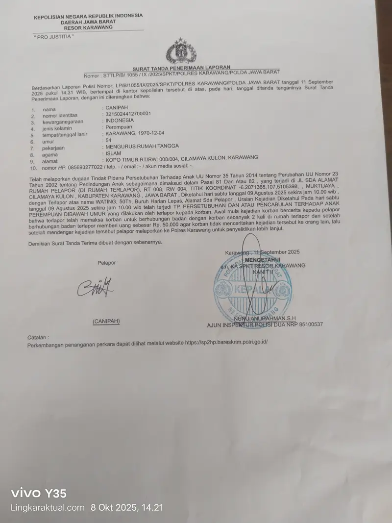> “Saya sudah melaporkan kasus ini ke Polres Karawang sejak 11 September 2025, tapi sampai sekarang belum ada tindakan tegas atau penyidikan lebih lanjut,” ujarnya.