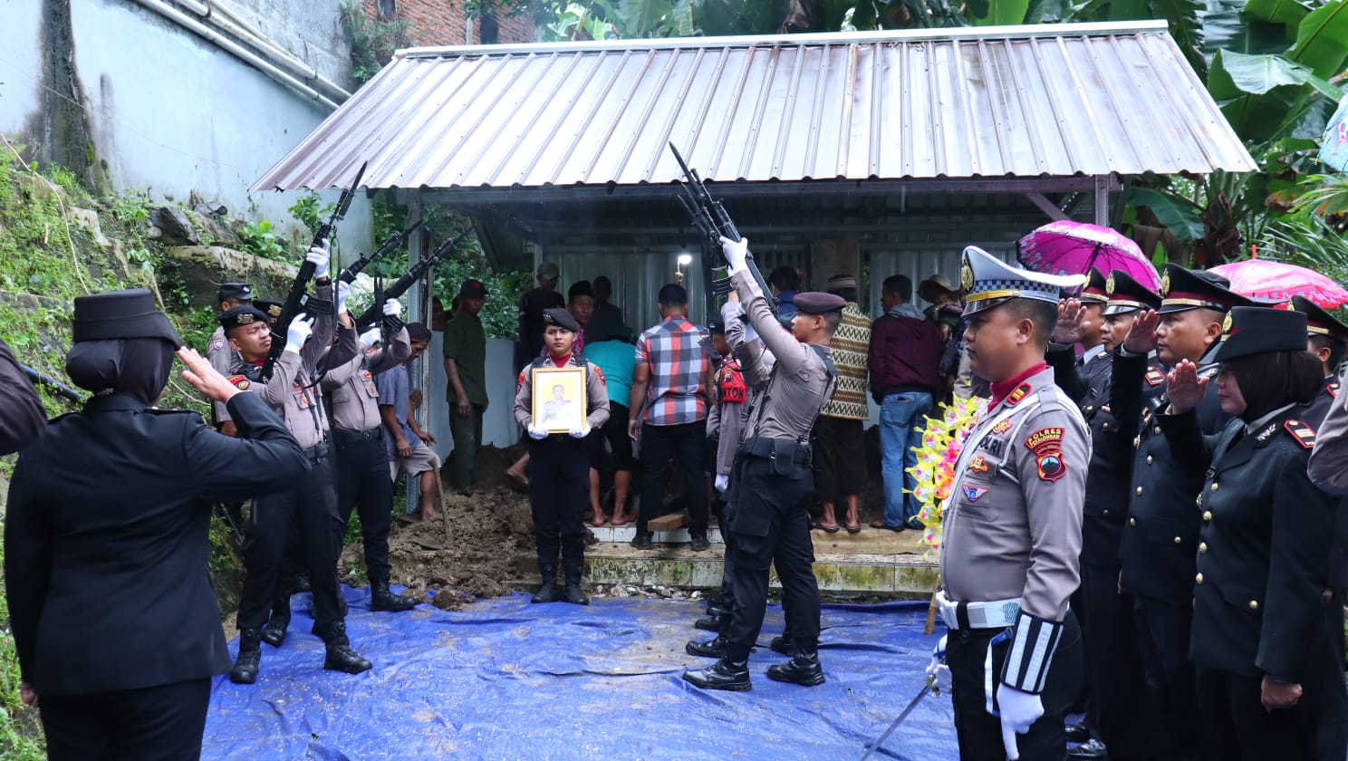 Tembakan salvo ke udara mengiringi prosesi penurunan jenazah ke liang lahat sebagai simbol penghormatan terakhir dari institusi Polri atas jasa-jasa almarhum selama bertugas sebagai ujung tombak kepolisian di tingkat desa (Bhabinkamtibmas).