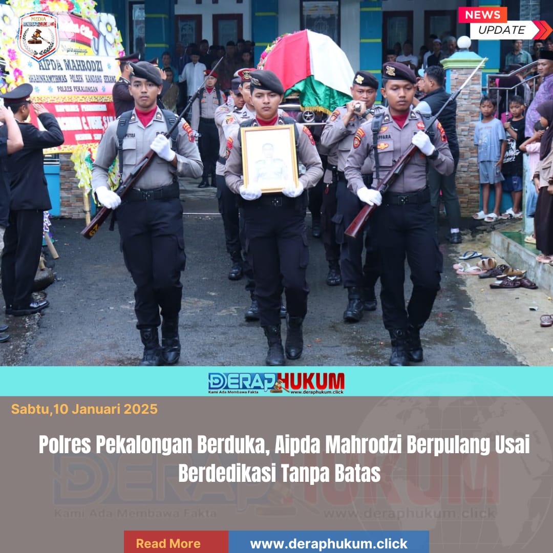 Pekalongan,Jawa Tengah | Deraphukum.click | Polres Pekalongan – Polda Jateng – Suasana duka menyelimuti Desa Bojongkoneng, Kecamatan Kandangserang, Kabupaten Pekalongan. Isak tangis keluarga dan rekan sejawat pecah saat jenazah Aipda Mahrodzi, sosok Bhabinkamtibmas Polsek Kandangserang yang dikenal berdedikasi tinggi, dilepas melalui upacara persemayaman dan pemakaman secara dinas Polri, Jumat (9/1/2026).