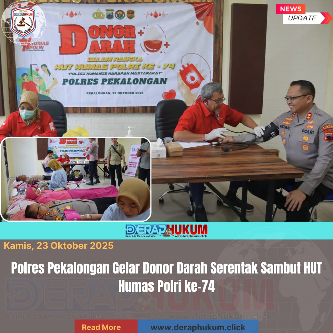 PEKALONGAN, JAWA TENGAH | Deraphukum.click | Dalam rangka menyambut Hari Jadi Humas Polri ke-74 tahun 2025, Polres Pekalongan menggelar kegiatan bakti sosial donor darah serentak di Aula Presisi Mapolres Pekalongan, Rabu (22/10/2025). Kegiatan ini digelar sebagai bentuk kepedulian sosial dan kemanusiaan dengan mengusung tema “Polisi Humanis, Harapan Masyarakat.”
