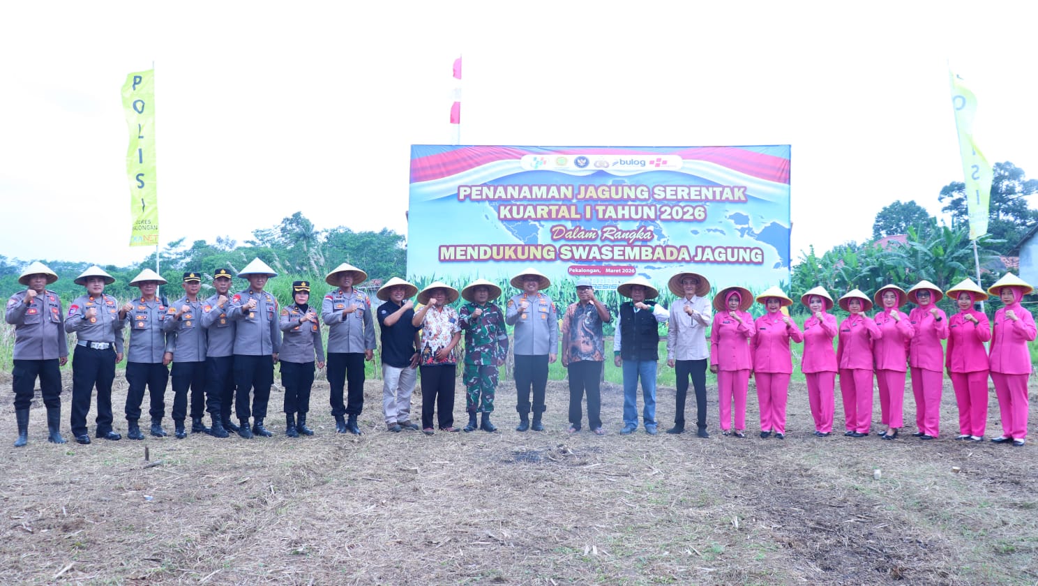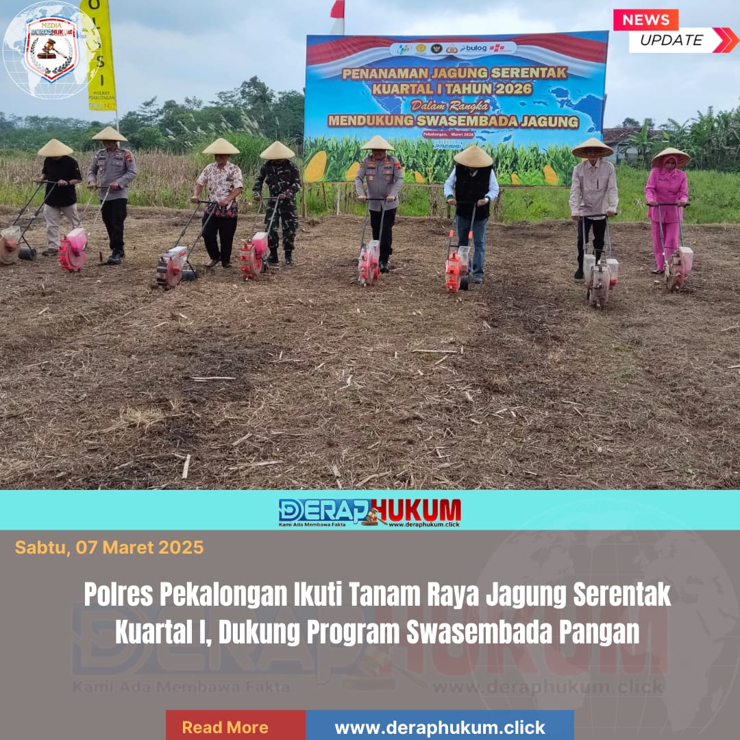 Pekalongan,Jawa Tengah | Deraphukum.click | Polres Pekalongan – Polda Jateng – Polres Pekalongan mengikuti kegiatan tanam raya jagung serentak kuartal I dalam rangka mendukung program swasembada jagung nasional, Sabtu (7/3/2026) sore. Kegiatan tersebut digelar di lahan pertanian Balai Penyuluhan Pertanian (BPP) Kedungwuni, Desa Tosaran, Kecamatan Kedungwuni, Kabupaten Pekalongan.