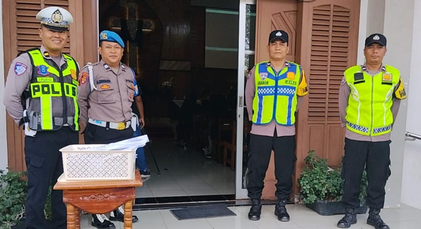 Dibawah kendali Kanit Regident Satlantas Ipda Sukendro, S.H. petugas pengamanan tampak melakukan penjagaan di sekitar lokasi gereja serta pengaturan aktivitas jemaat yang datang, guna memberikan rasa aman dan nyaman selama pelaksanaan ibadah.