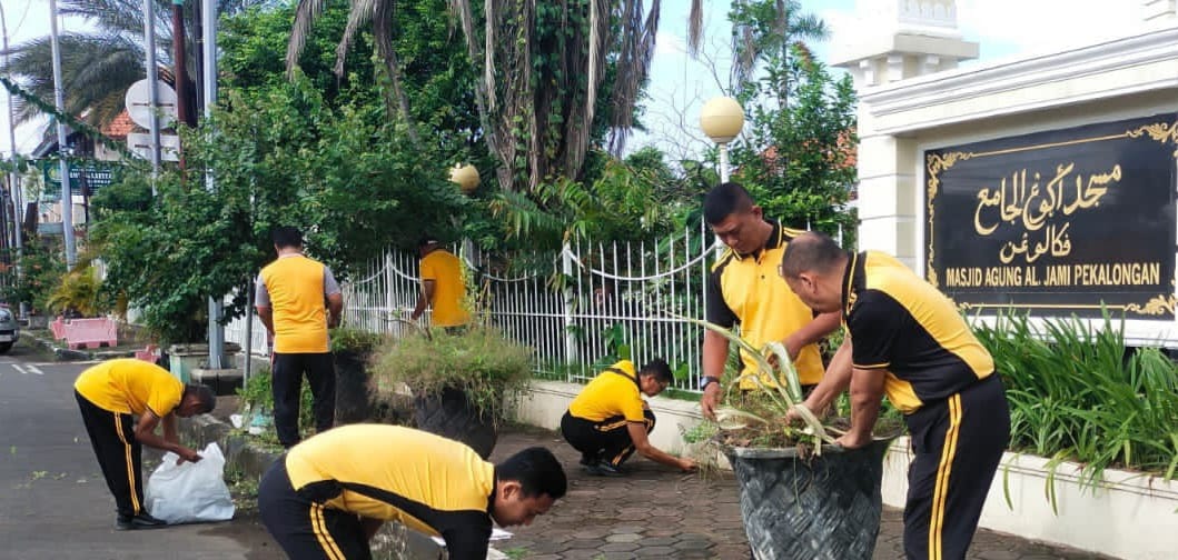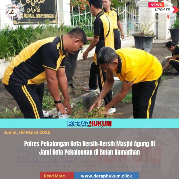Pekalongan Kota, | Deraphukum.click | Polres Pekalongan Kota – Polda Jateng – Dalam rangka mendukung program Gerakan Indonesia Asri, Polres Pekalongan Kota melalui Polsek Pekalongan Timur melaksanakan kegiatan bakti sosial dengan membersihkan lingkungan Masjid Agung Al Jami yang berada di Jalan Wachid Hasyim, Kelurahan Kauman, Kota Pekalongan, Jumat (6/3/2026) pagi.