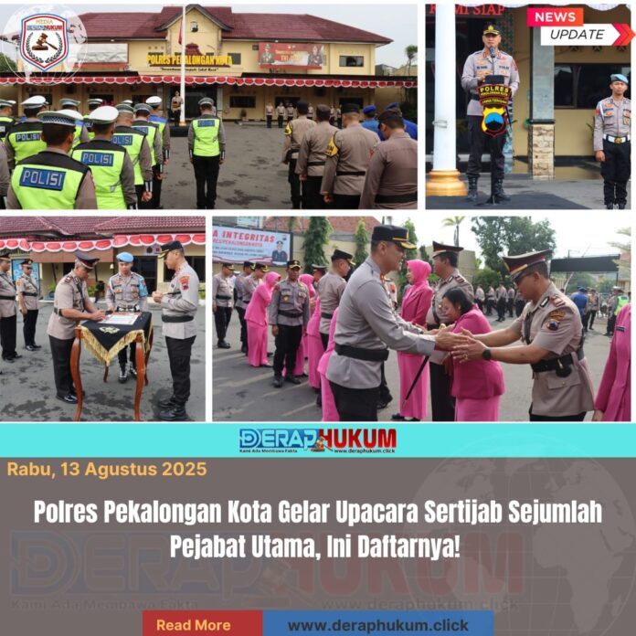 PEKALONGAN KOTA, JAWA TENGAH | DerapHukum.click | Polres Pekalongan Kota – Polda Jateng – Kapolres Pekalongan Kota AKBP Riki Yariandi S.H., S.I.K., M.H. pimpin pelaksanaan upacara serah terima jabatan (Sertijab) sejumlah Pejabat Utama di halaman Mapolres Pekalongan Kota, Rabu (13/8/2025) pagi.