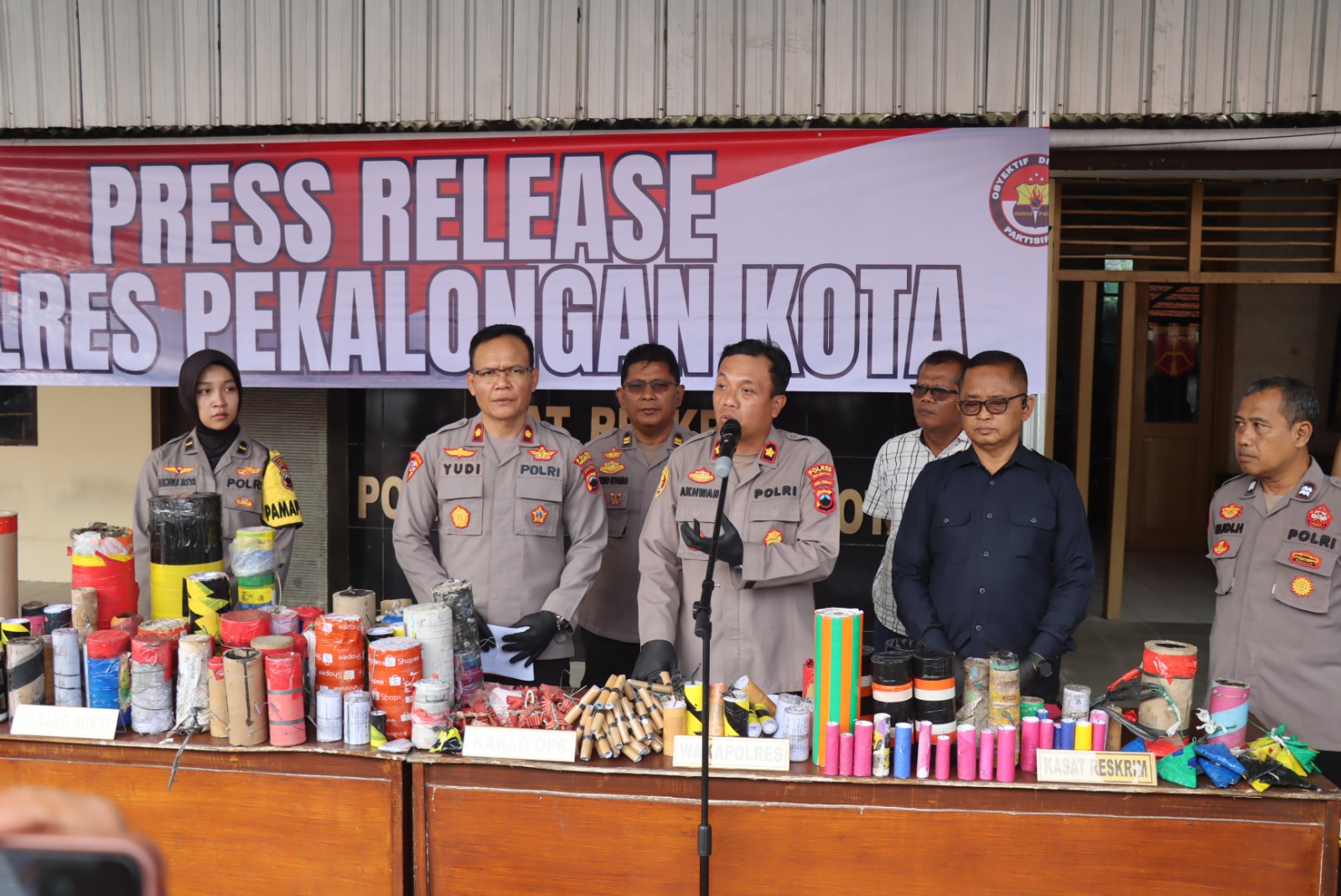 Konferensi pers dipimpin Wakapolres Pekalongan Kota Kompol Dr. Akhwan Nadzirin, S.H., M.H. didampingi sejumlah pejabat utama, diantaranya Kabagops Kompol Paryudi, S.H., M.H., Kasat Reskrim AKP Setiyanto, S.H., M.H., Kasat Intelkam AKP Maryoto, S.Pd, serta Ps. Kasi Humas Iptu Purno Utomo, S.H. dan Pamapta Ipda Rahma ‘Aisya Putri, S.Tr.I.K.