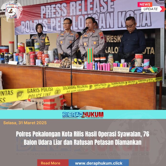 Pekalongan Kota, | Deraphukum.click | Polres Pekalongan Kota – Polda Jateng – Polres Pekalongan Kota mengungkap hasil operasi penertiban / razia balon udara liar dan petasan selama perayaan Syawalan 1447 H/2026 M. Dalam konferensi pers yang digelar Selasa (31/3/2026) pagi, di halaman parkir Satreskrim Polres Pekalongan Kota.