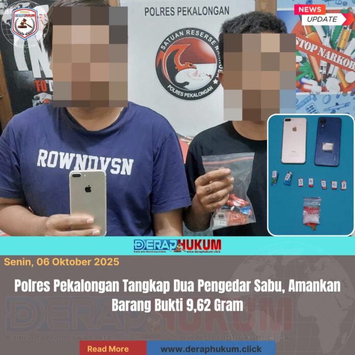PEKALONGAN, JAWA TENGAH | DerapHukum.click | Satuan Reserse Narkoba (Satresnarkoba) Polres Pekalongan, Polda Jawa Tengah, berhasil mengungkap kasus peredaran narkotika jenis sabu di wilayah Kecamatan Kesesi, Kabupaten Pekalongan. Dua orang pelaku, masing-masing BA (37) dan AH (30), diamankan dengan barang bukti sabu seberat bruto ± 9,62 gram.