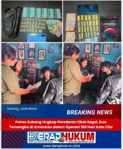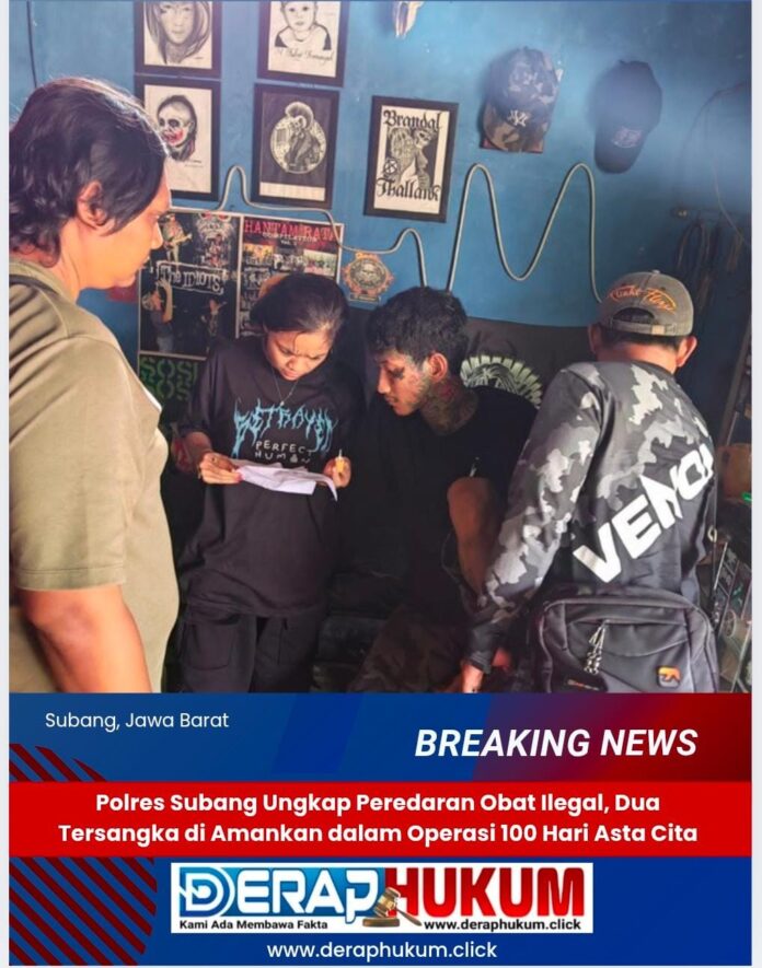 SUBANG | Deraphukum.click | 25 Desember 2024 – Dalam upaya memberantas peredaran obat-obatan terlarang, Satuan Reserse Narkoba (Sat Res Narkoba) Polres Subang berhasil mengungkap dua kasus penyalahgunaan sediaan farmasi tanpa izin. Pengungkapan ini merupakan bagian dari program nasional 100 Hari ASTA CITA (Anti Stigma, Tegas, dan Cegah Tindak Pidana Narkotika) yang diinisiasi oleh Satgas Tipid Narkotika.