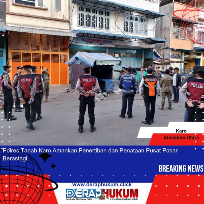Polres Tanah Karo mengamankan jalannya kegiatan penertiban dan penataan kios Tempat Penampungan Sementara (TPS) di Pusat Pasar Berastagi, Kecamatan Berastagi, Kabupaten Karo, Jumat (7/2/2025). Kegiatan yang dimulai sejak pukul 06.00 WIB ini dipimpin oleh Waka Polres Tanah Karo, Kompol Zulham, S.H., S.Kom., M.H.