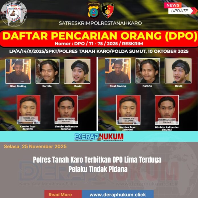 Satuan Reserse Kriminal (Satreskrim) Polres Tanah Karo resmi menerbitkan Daftar Pencarian Orang (DPO) terhadap lima terduga pelaku tindak pidana. Penerbitan DPO tersebut tercantum dalam Nomor: DPO/71–75/2025/RESKRIM, berdasarkan LP/A/14/X/2025/SPKT/POLRES TANAH KARO/POLDA SUMUT yang dikeluarkan pada 10 Oktober 2025.