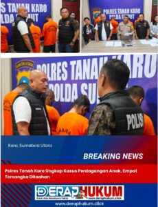 KARO | Deraphukum.click | Satuan Reserse Kriminal Polres Tanah Karo berhasil mengungkap kasus dugaan perdagangan anak yang melibatkan empat orang tersangka. Kasus ini terungkap berdasarkan laporan dari orang tua korhan RD(29), warga Kecamatan Berastagi, yang dibuat pada 9 Januari 2025.