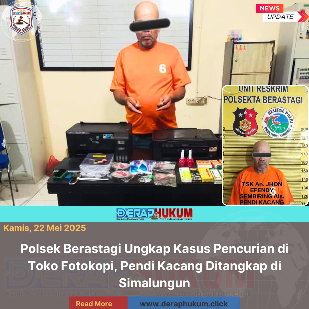 KARO, Sumatra Utara l Deraphukum.click l Unit Reskrim Polsek Berastagi berhasil mengungkap kasus pencurian yang terjadi di sebuah toko fotokopi milik warga Ianadijaya(41), warga Jalan Mesjid, Kelurahan Tambak Lau Mulgap II, Kecamatan Berastagi, Kabupaten Karo.