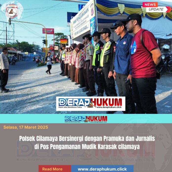 Karawang,Jawa Barat | deraphukum.click | Dalam rangka menjaga kelancaran dan keamanan arus mudik Lebaran, jajaran Polsek Cilamaya bersinergi bersama anggota Pramuka serta jurnalis dari Ikatan Wartawan Online Indonesia (IWOI) di Pos Pengamanan arus mudik Operasi Ketupat Lodaya 2026 yang berada di pertigaan lampu merah Karasak, Kabupaten Karawang.