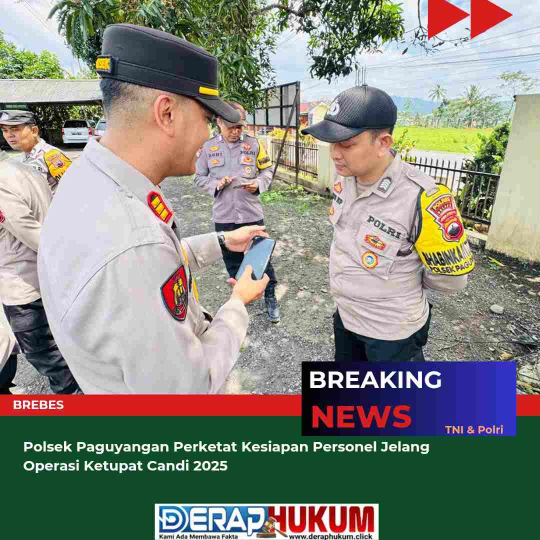 BREBES, | Deraphukum.click. | Dalam rangka memastikan kesiapan personel menjelang Operasi Ketupat Candi 2025, Polsek Paguyangan menggelar apel pengecekan di halaman Mako Polsek Paguyangan pada Kamis, 20 Maret 2025. Apel ini dipimpin langsung oleh Kapolsek Paguyangan, AKP Tasudin, S.H., M.H., dan diikuti oleh seluruh anggota kepolisian setempat