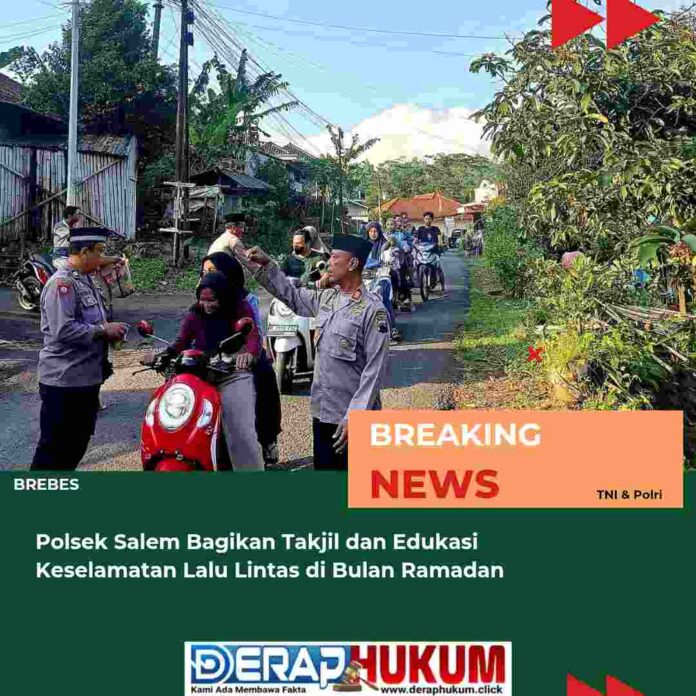 BREBES. | Deraphukum.click. | Dalam rangka meningkatkan kepedulian sosial dan mempererat hubungan dengan masyarakat di bulan suci Ramadan, Polsek Salem Polres Brebes menggelar kegiatan berbagi takjil kepada pengendara dan pejalan kaki yang melintas di depan Mapolsek Salem pada Rabu (12/3/2025) sore.