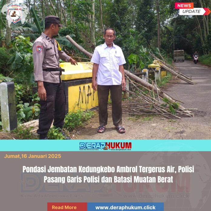 Pekalongan,Jawa Tengah | Deraphukum.click | Polres Pekalongan – Polda Jateng – Akses utama yang menghubungkan Desa Kedungkebo dengan Desa Kaligawe di Kecamatan Karangdadap kini dalam kondisi waspada. Pondasi jembatan di Dukuh Kedungkebo dilaporkan ambrol setelah tergerus derasnya aliran air sungai.
