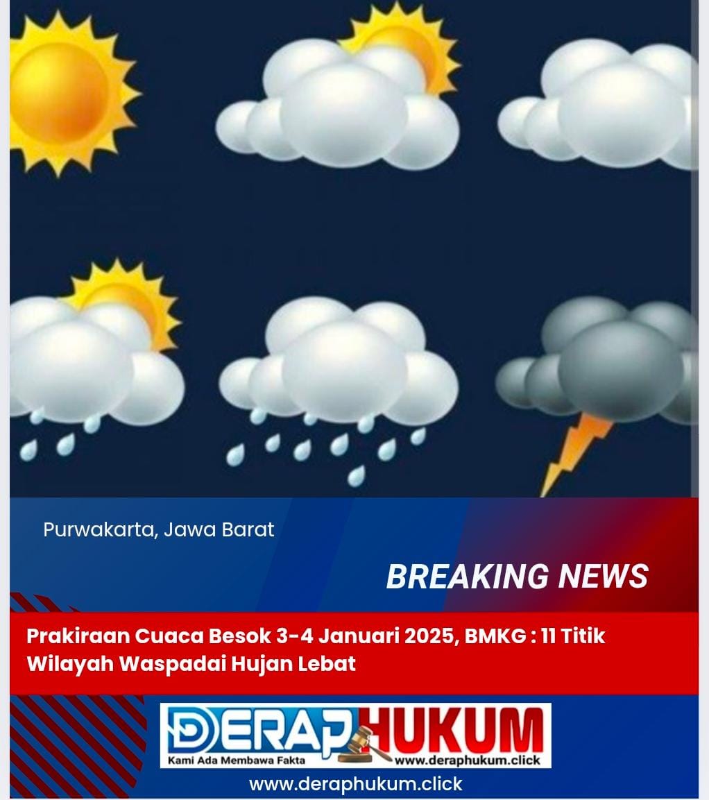 Berikut prakiraan cuaca 3-4 Januari 2025 di sejumlah wilayah yang di kutip wartawan Media DERAP HUKUM.clik dari akun resmi BMKG.(@.infobmkg).