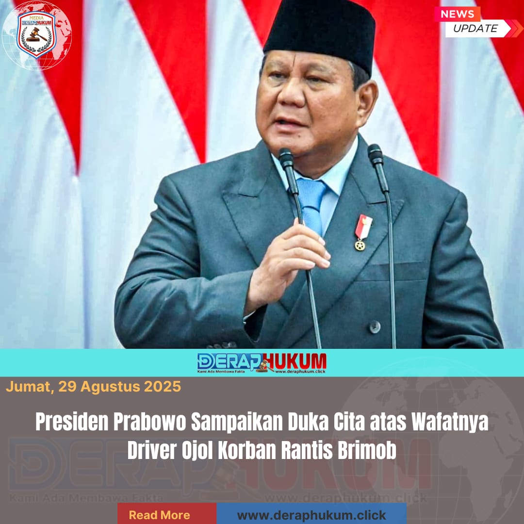 JAKARTA | DerapHukum.click | Presiden Republik Indonesia, Prabowo Subianto, buka suara terkait wafatnya Affan Kurniawan, seorang driver ojek online yang meninggal dunia setelah terlindas kendaraan taktis (rantis) Brimob pada Kamis (28/8) malam.