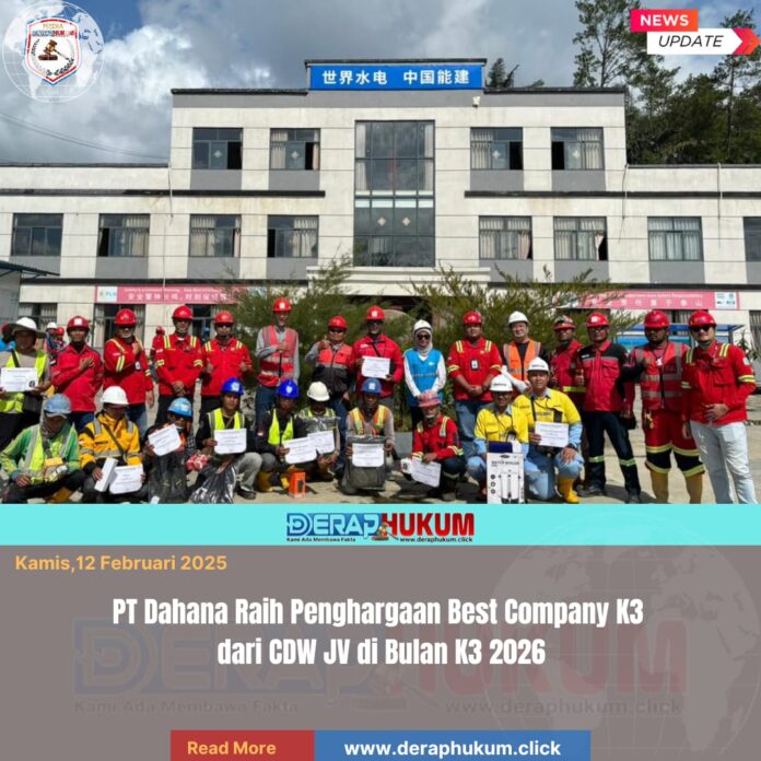 Bandung Barat, l Deraphukum.click l PT Dahana memperkuat reputasinya di sektor konstruksi dengan meraih predikat Best Company dalam Peringatan Bulan Keselamatan dan Kesehatan Kerja (K3) 2026. Penghargaan ini diserahkan oleh Management CDW JV pada seremoni di Bandung Barat, Kamis (12/2/2026).