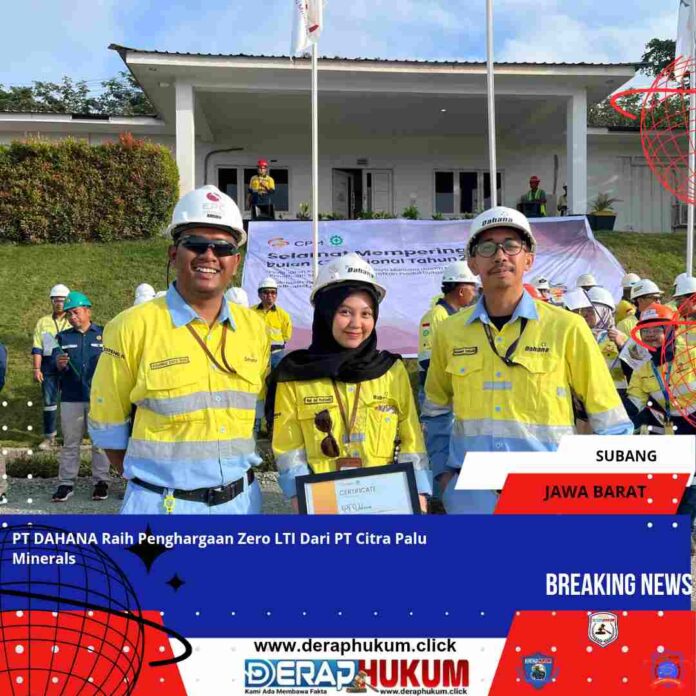 SUBANG, | Deraphukum.click | PT. DAHANA kembali menunjukkan komitmennya terhadap keselamatan kerja dengan meraih penghargaan “Zero LTI in 2024” dari PT Citra Palu Minerals. Penghargaan ini diberikan dalam rangkaian kegiatan Bulan K3 Nasional yang berlangsung di PT Citra Palu Minerals, Sulawesi Tengah,Rabu26/2/2025.