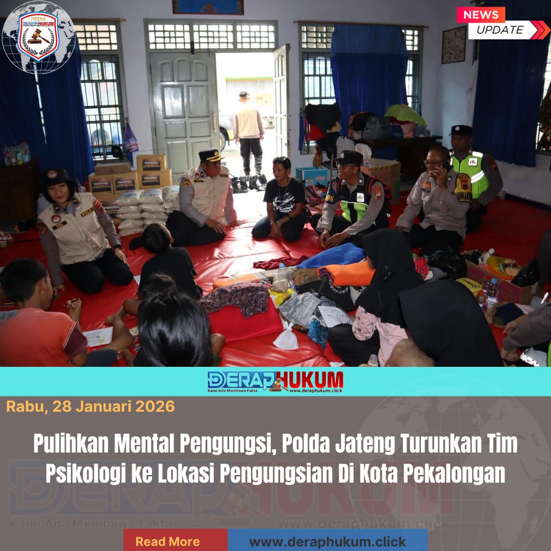 Pekalongan, Jawa Tengah | DerapHukum.click | Polres Pekalongan Kota, Polda Jateng, Bagian Psikologi (Bagpsi) Biro SDM Polda Jawa Tengah, hadir di Polres Pekalongan Kota melaksanakan kunjungan sekaligus memberikan psikologi trauma healing bagi para korban banjir di sejumlah lokasi pengungsian wilayah Kota Pekalongan, Selasa (27/1/2026).
