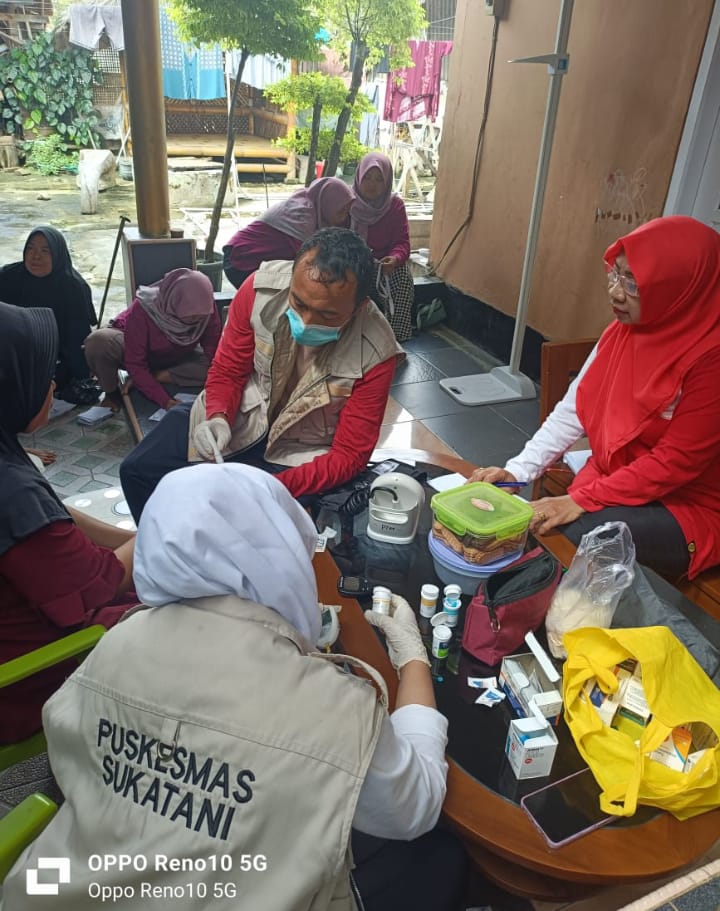 Dalam kegiatan tersebut, tim medis Puskesmas Sukatani memberikan berbagai layanan kesehatan, di antaranya pemeriksaan kesehatan umum, pengecekan tekanan darah, serta pemberian pengobatan ringan bagi warga yang mengalami keluhan kesehatan.