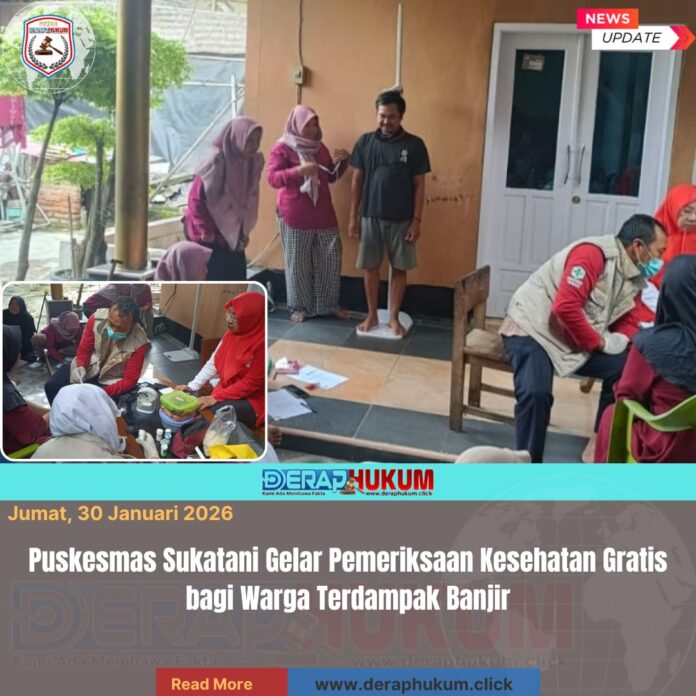 Karawang, Jawa Barat | DerapHukum.click | Puskesmas Sukatani menggelar pemeriksaan kesehatan gratis bagi warga terdampak banjir yang berlangsung di lokasi BPK Lurah H. Udin AG, Desa Rawagempol Wetan, Kecamatan Cilamaya, Kabupaten Karawang. Kegiatan ini dilaksanakan sebagai bentuk kepedulian terhadap kondisi kesehatan masyarakat pascabanjir.