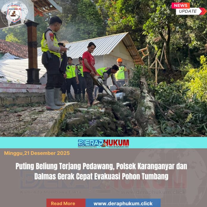 Pekalongan,Jawa Tengah | Deraphukum.click | Polres Pekalongan – Polda Jateng – Cuaca ekstrem melanda wilayah Kecamatan Karanganyar, Kabupaten Pekalongan, Sabtu (20/12/2025) sore. Hujan lebat disertai angin puting beliung mengakibatkan sedikitnya 16 rumah warga mengalami kerusakan dan sejumlah pohon besar tumbang menimpa pemukiman di Dukuh Bandung, Desa Pedawang.