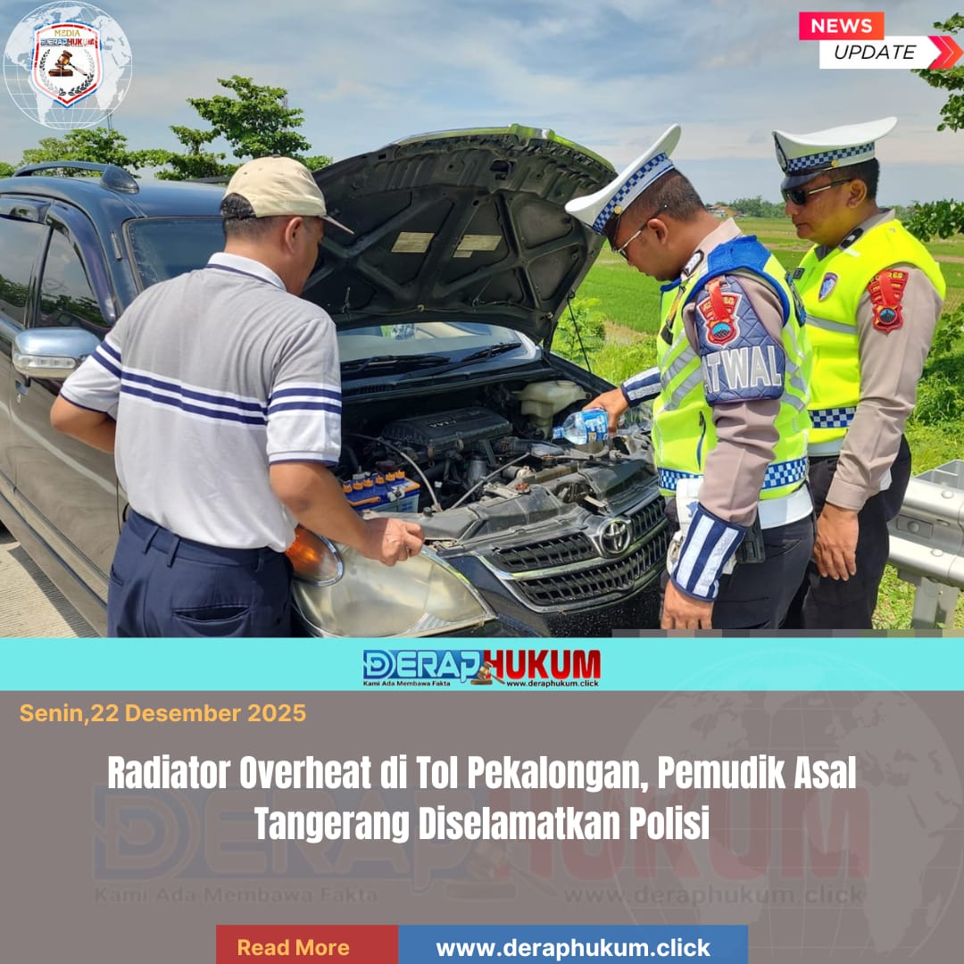 Pekalongan,Jawa Tengah | Deraphukum.click | Polres Pekalongan Polda Jateng – Aksi sigap ditunjukkan jajaran Satgas Patroli Polres Pekalongan saat mendapati seorang pengendara mobil yang mengalami kendala mesin di jalur bebas hambatan. Sebuah mobil Toyota Avanza tujuan Tangerang-Klaten terpaksa berhenti darurat di Kilometer 336 Tol Pemalang-Batang akibat mesin mengalami overheat, Minggu (21/12/2025).