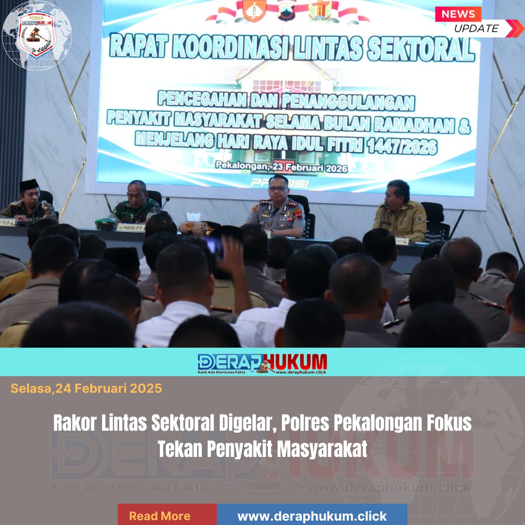 Pekalongan,Jawa Tengah | Deraphukum.click | Polres Pekalongan – Polda Jateng – Polres Pekalongan menggelar Rapat Koordinasi (Rakor) Lintas Sektoral dalam rangka pencegahan dan penanggulangan penyakit masyarakat selama bulan Ramadhan dan menjelang Hari Raya Idul Fitri 1447 H/2026 M. Kegiatan tersebut berlangsung pada Senin (23/2/2026) di ruang aula Setia Polres Pekalongan.
