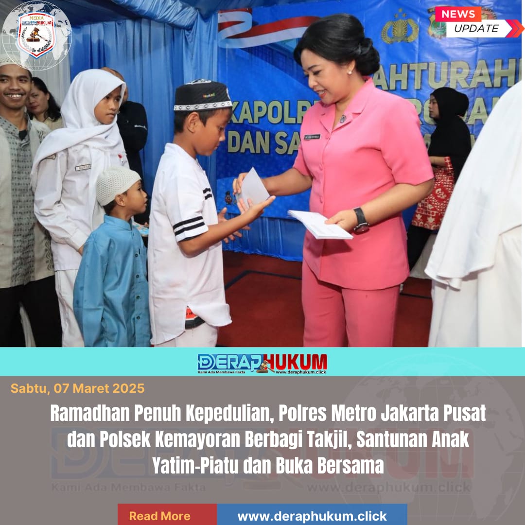 Jakarta Pusat, | Deraphukum.click | Semangat berbagi dan kepedulian di bulan suci Ramadhan 1447 H ditunjukkan oleh jajaran Polres Metro Jakarta Pusat bersama Polsek Kemayoran dengan menggelar kegiatan pembagian takjil kepada masyarakat, santunan anak yatim-piatu, serta buka puasa bersama di wilayah Polsek Kemayoran, Jakarta Pusat, Jumat (6/3/2026).