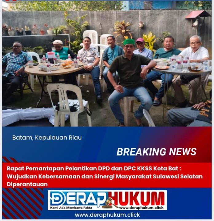 BATAM-KEPRI | Deraphukum.click | 5 Januari 2025 — Dalam semangat memperkuat persaudaraan dan solidaritas di antara masyarakat perantau Sulawesi Selatan, Badan Pengurus Daerah (BPD) Kerukunan Keluarga Sulawesi Selatan (KKSS) Kota Batam melaksanakan rapat pemantapan acara pelantikan pengurus DPD KKSS Kota Batam dan DPC KKSS se-Kota Batam. Acara ini berlangsung di kediaman Ketua KKSS Kota Batam, Andi Tajuddin, dengan suasana penuh kehangatan dan kebersamaan, Minggu (5/1).